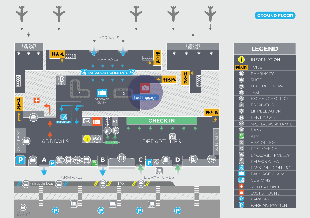 In case of lost or damaged baggage, please immediately go to the Lost & Found Department, which is located near the baggage claim area, i.e. in the Arrivals Area after Passport Control and before Customs Control.